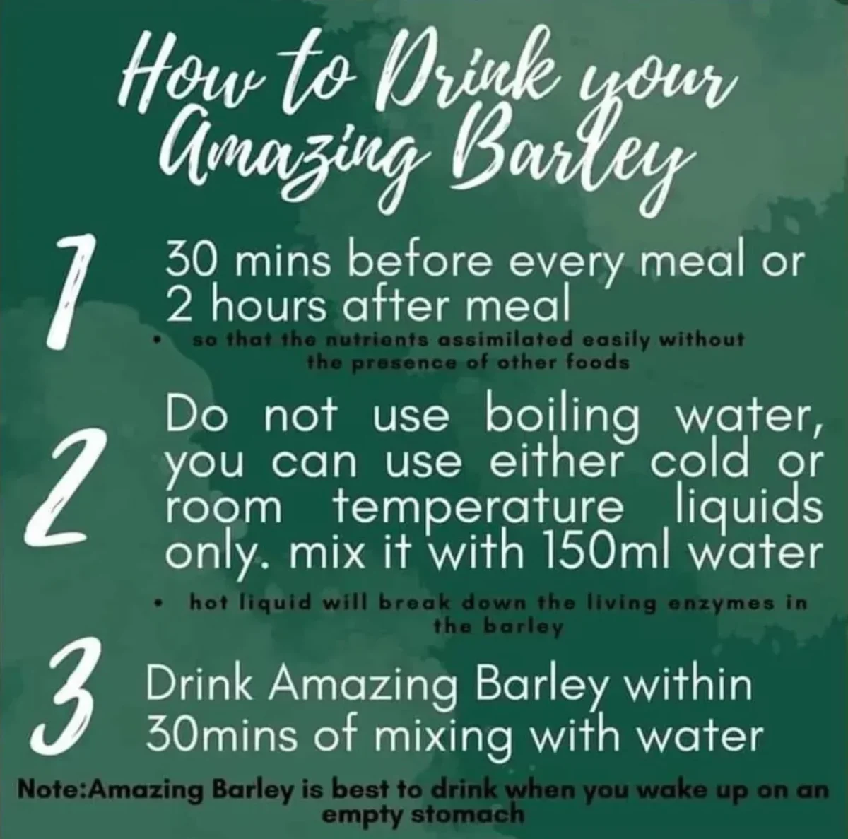 Drink the Amazing Barley Drink on an empty stomach, 30 minutes to 1 hour before meals. Mix with 160 to 180 ml of water (warm—not hot, boiling, or cold). Stir for 30 seconds until all contents are dissolved.