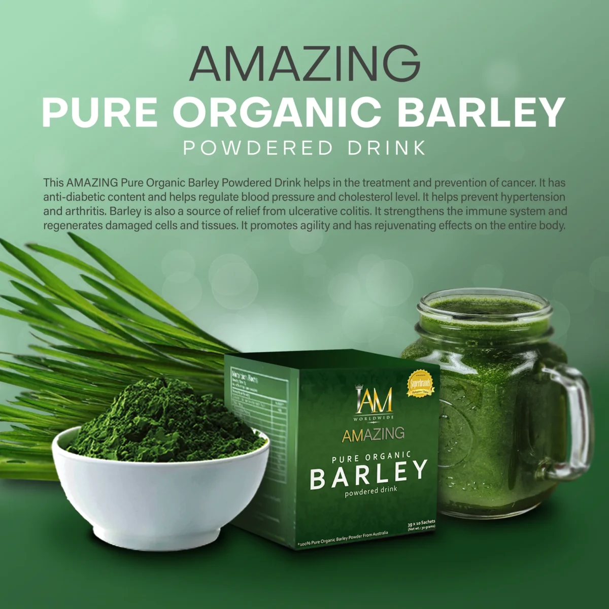 The Amazing Barley Drink is a daily dietary supplement made from barley grass.