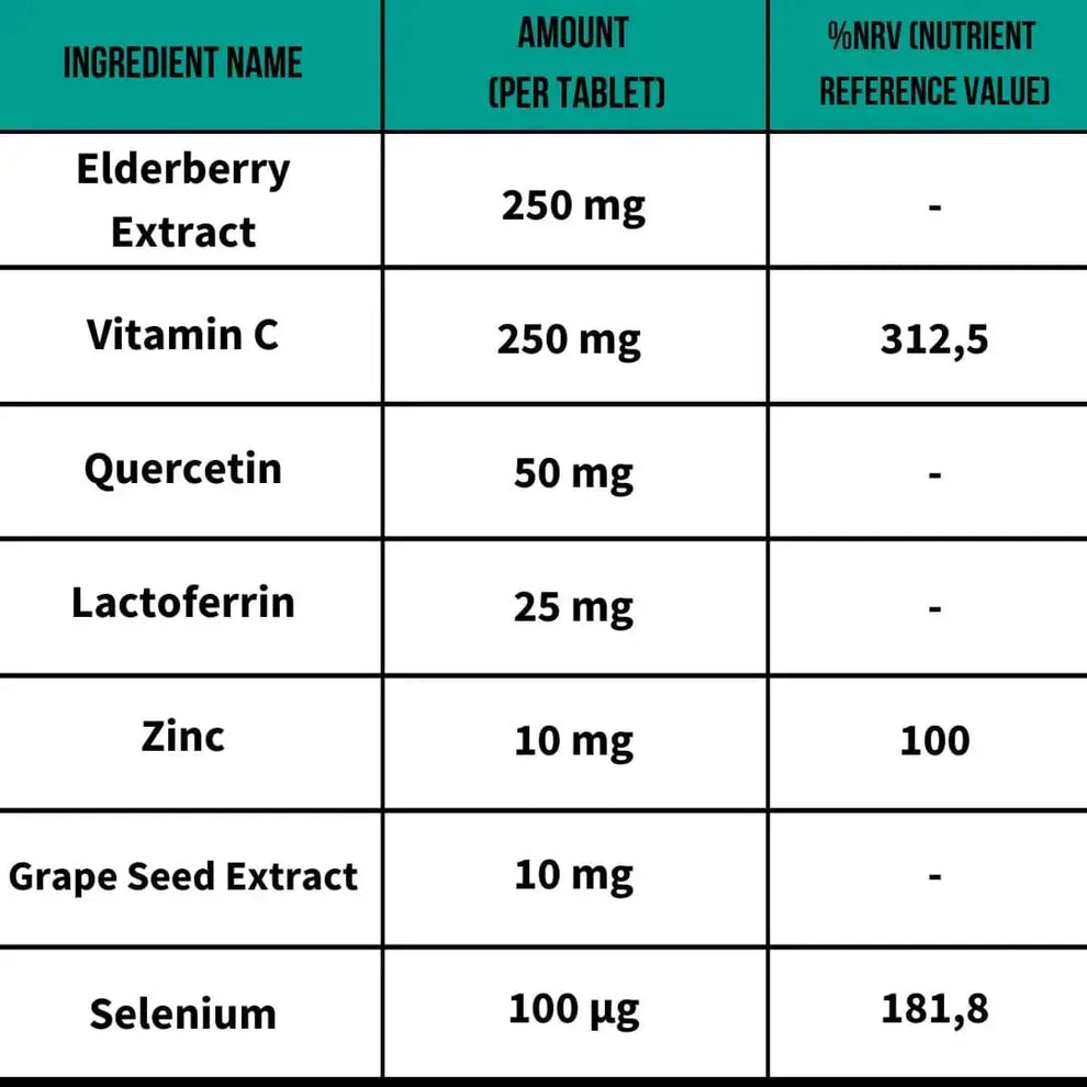 Black Elderberry Extract, Vitamin C, Quercetin, Lactoferrin (Inferrin), Zinc, Grape Seed Extract, Selenium.