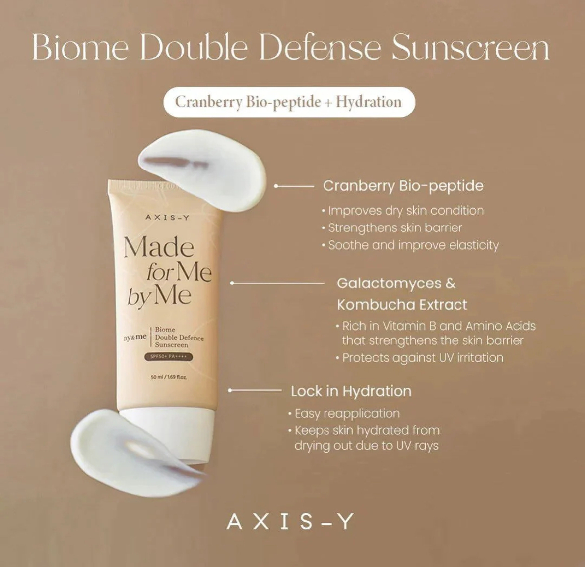 AXIS-Y Biome Double Defense Sunscreen is a lightweight chemical sunscreen that provides superior protection for the skin from harmful sun rays all year round. It contains a special blend of bioactive ingredients that strengthen the skin barrier and protect it from negative environmental influences. It is characterized by its water-based formula that absorbs quickly without leaving any greasy or white residue on the skin, making it suitable for daily use.
