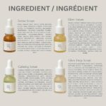 Soothing Serum Centella Asiatica Extract, Artemisia Vulgaris Extract, Sodium Hyaluronate. Glow Betaine Salicylate (BHA), Tamanu Oil, Tea Tree Extract. Deep Serum Glycerin, Niacinamide, Soybean Extract, Barley Extract, Rice Extract, Sesame Extract. Revive Serum Ginseng Root Extract. Enosine, Matte. Sutake Extract