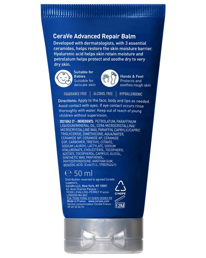 CeraVe Advanced Repair Ointmentis your savior for very dry, damaged and cracked skin! This intensive repair balm has been specially developed to intensively care for, protect and hydrate rough, vulnerable skin for a long time. Enriched with a powerful combination of petrolatum, hyaluronic acid and three essential ceramides, this balm ensures a stronger skin barrier and softens the skin immediately upon application. The Advanced Repair Ointment from CeraVe is a real all-rounder: suitable for face, body and lips. The formula does not feel greasy, is quickly absorbed and allows your skin to breathe. This balm helps to restore the natural skin barrier and retain moisture for long-lasting hydration and immediate relief from irritations. The repairing balm is suitable for all skin types.