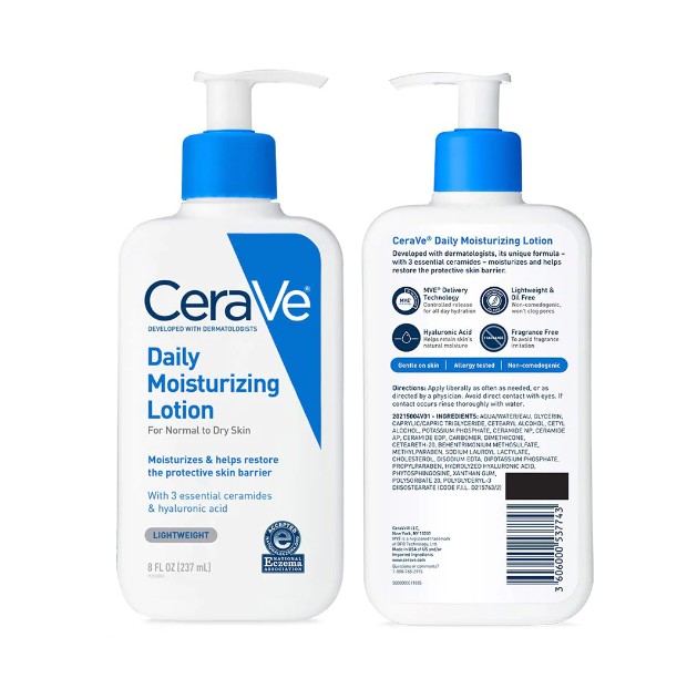 CeraVe Daily Moisturizing Lotion is a lightweight, oil-free moisturizer that helps hydrate the skin and restore its natural barrier. Formulated with 3 essential ceramides that work together to lock in skins moisture and help restore your skin’s protective barrier. MVE technology encapsulates ceramides to ensure efficient delivery within the skin’s barrier and slow release over time. Supporting your protective skin barrier, long after you’ve finish applying. Our daily moisturizer leaves the skin feeling comfortable and is gentle on the skin as it provides 24-hour hydration.
