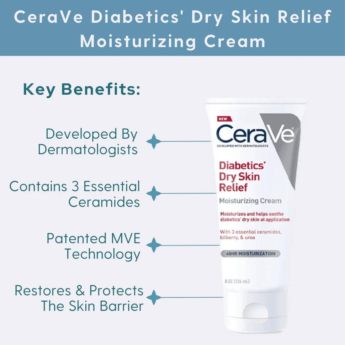 Effective ingredients for diabetes skin issues include ceramides that help replenish the skin’s barrier to prevent moisture loss and urea that helps draw moisture from the environment. CeraVe Diabetics’ Skin Relief Moisturizing Cream features both of these ingredients to soften and smooth diabetes dry skin.