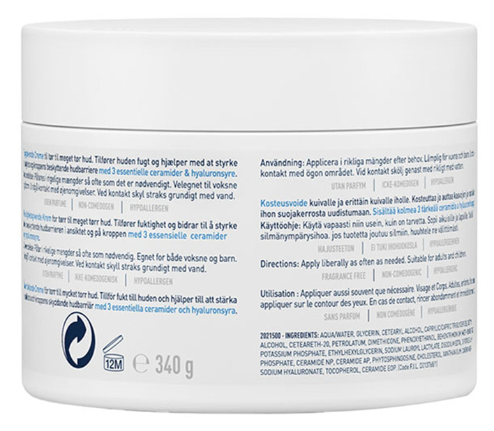 This moisturizing cream with a rich but non-fat consistency contains three essential ceramides and hyaluronic acid. These ingredients work synergistically to moisturize and protect the natural skin barrier. Thanks to MVE® Delivery Technology, which provides controlled release of ingredients, the cream retains moisture in the skin and hydrates it for 24 hours. The cream is gentle on the skin and makes the overdried, itchy spots become soft and nourished again. Created by dermatologists.
