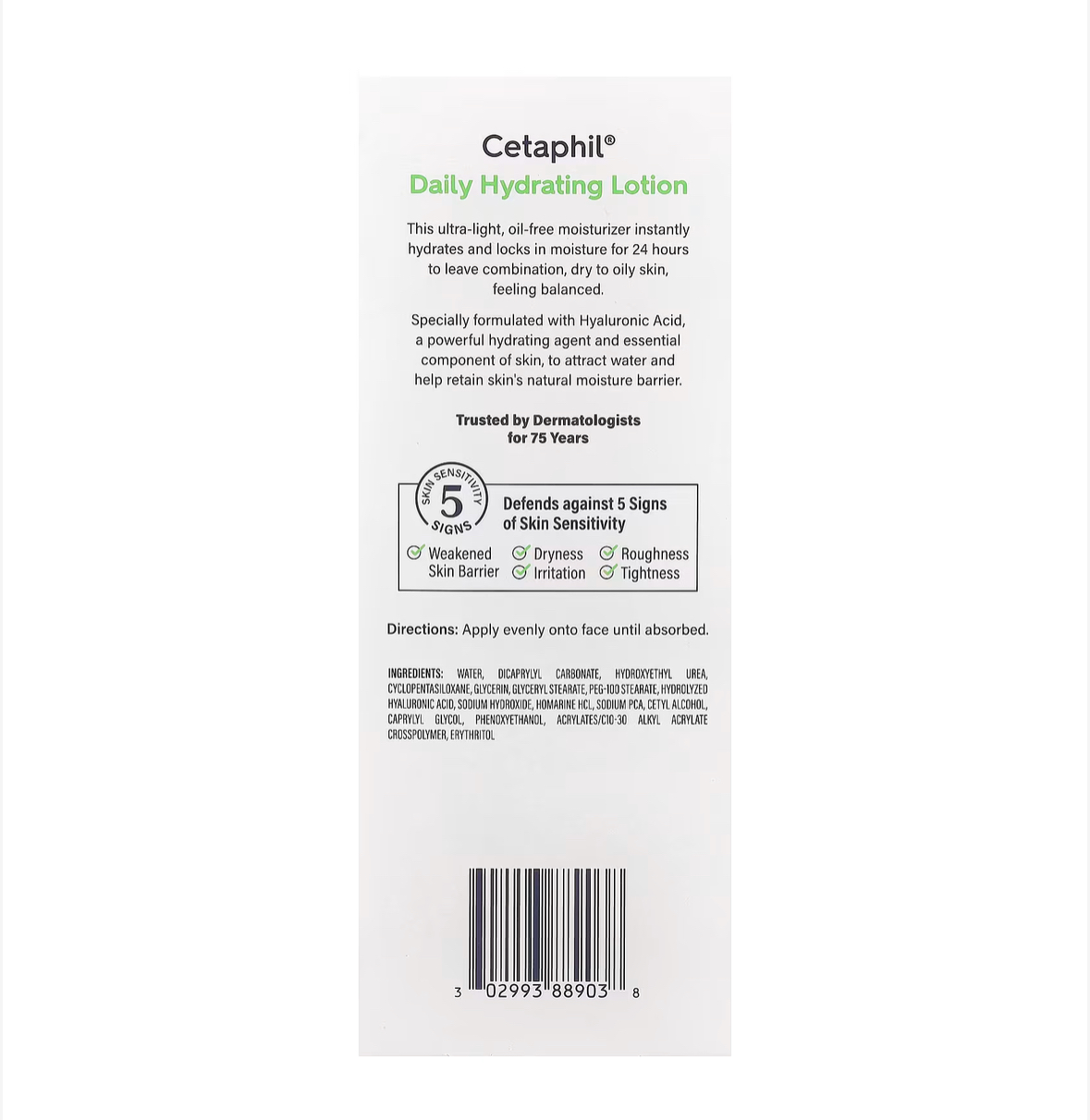 Formulated with Hyaluronic Acid and clinically-proven gentle on sensitive skin, this oil-free facial lotion hydrates for 24 hours and protects skin from dryness without clogging pores.