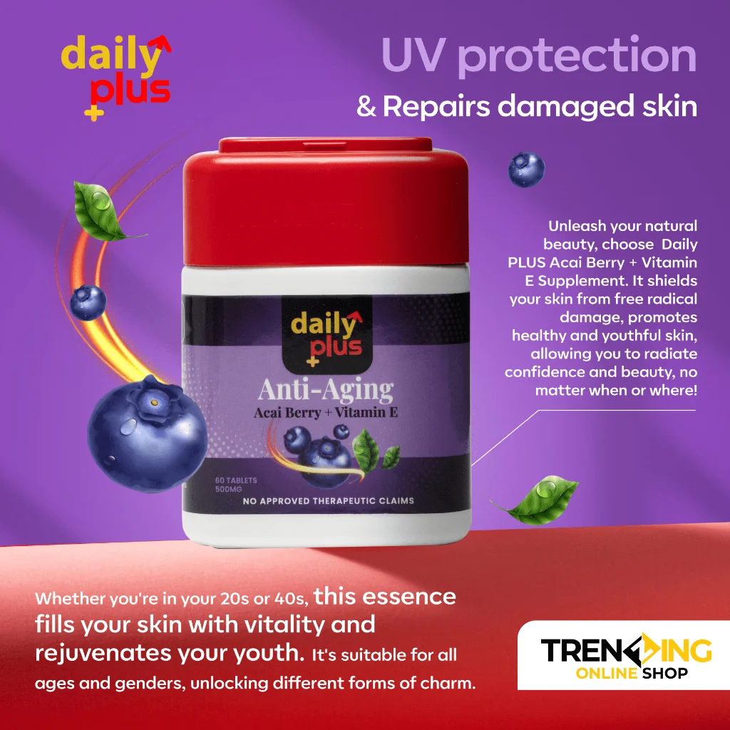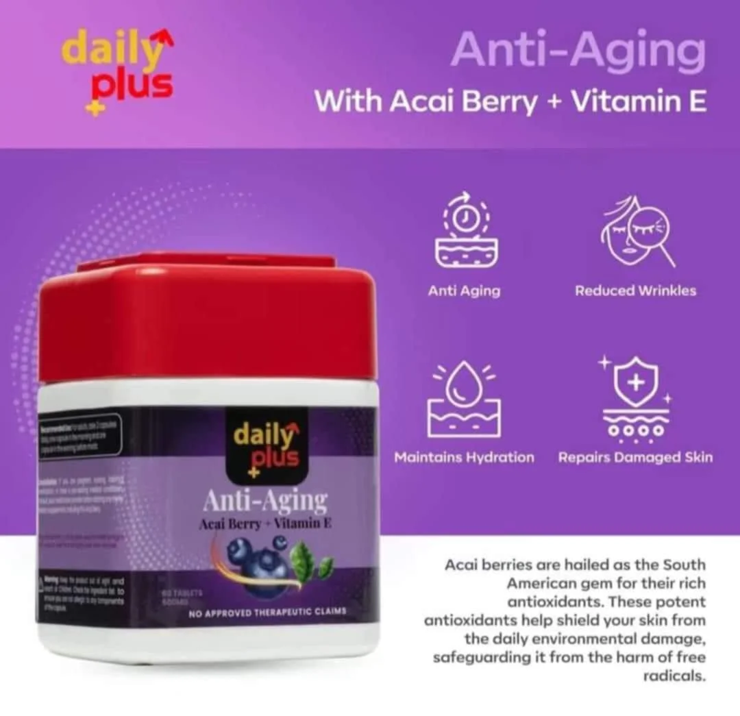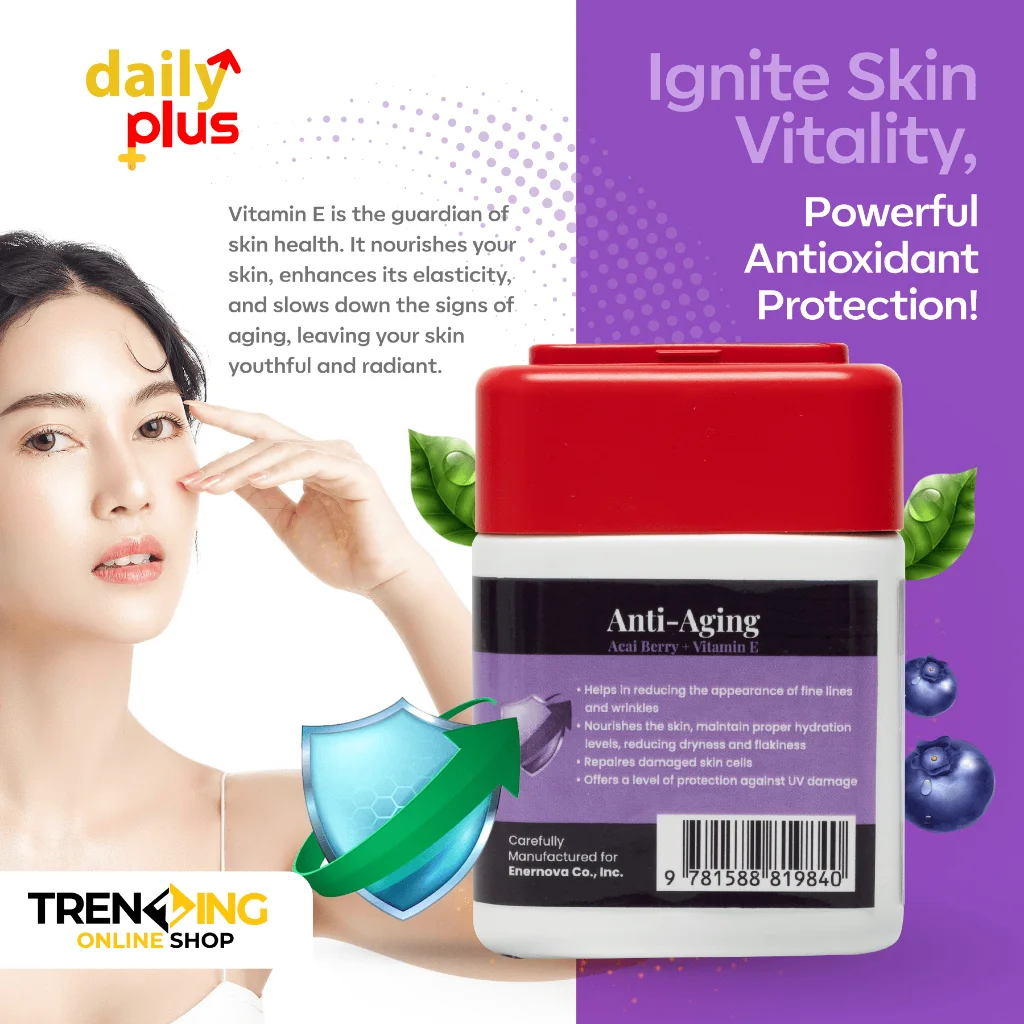 In today’s modern world, where we face pollution and stress daily, our skin deserves extra care and protection. That’s why we introduce our Daily Plus Anti-Aging Supplement that is formulated with Acai Berry and Vitamin E – your secret weapon for healthy and beautiful skin!