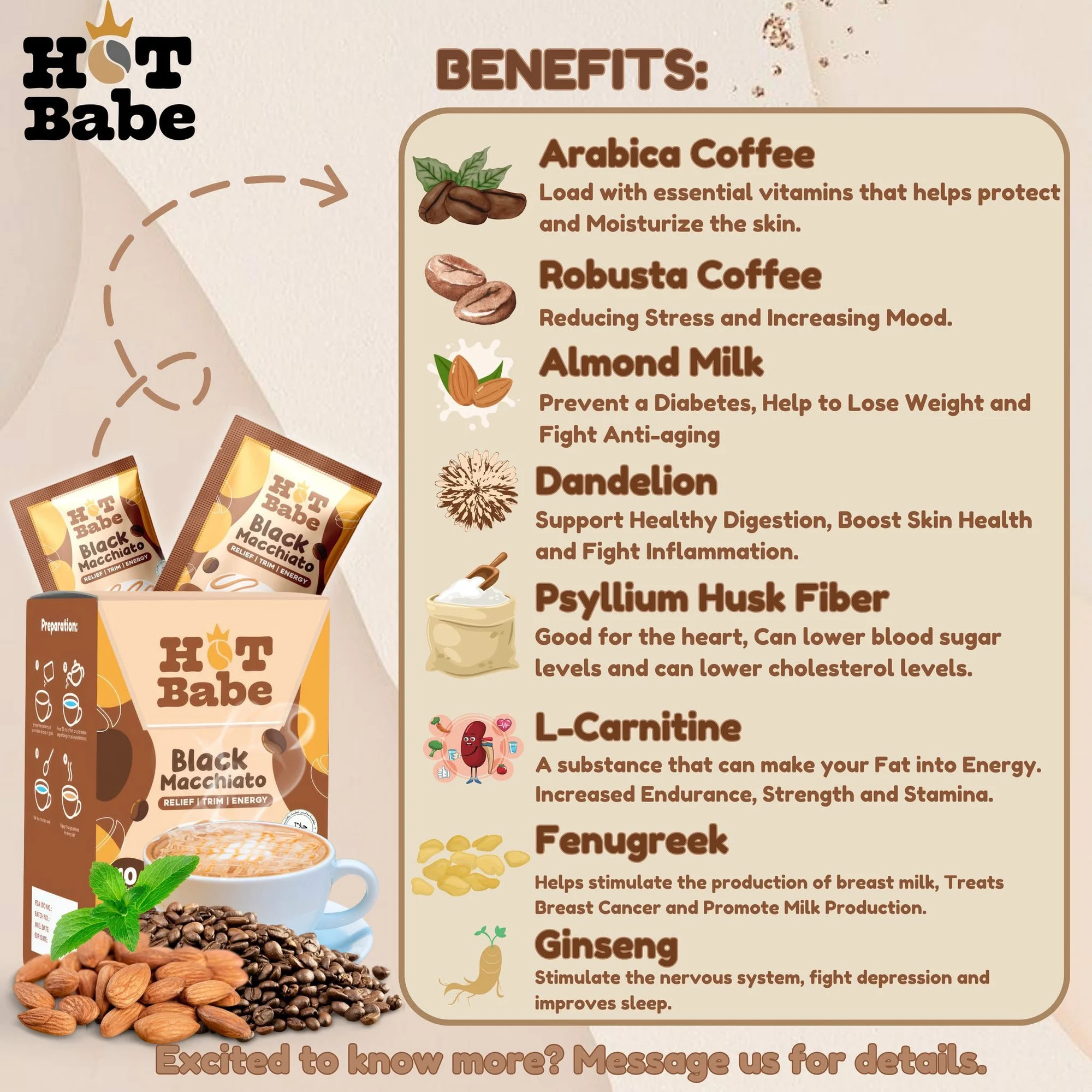 Arabica Coffee, Robusta Coffee, Almond Milk, Dandelion, Psyllium Husk Fiber, L-Carnitine, Fenugreek, Ginseng