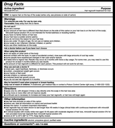 • ACTIVE INGREDIENT: Minoxidil Topical Solution USP 5% for Men , the #1 dermatologist recommended active ingredient.