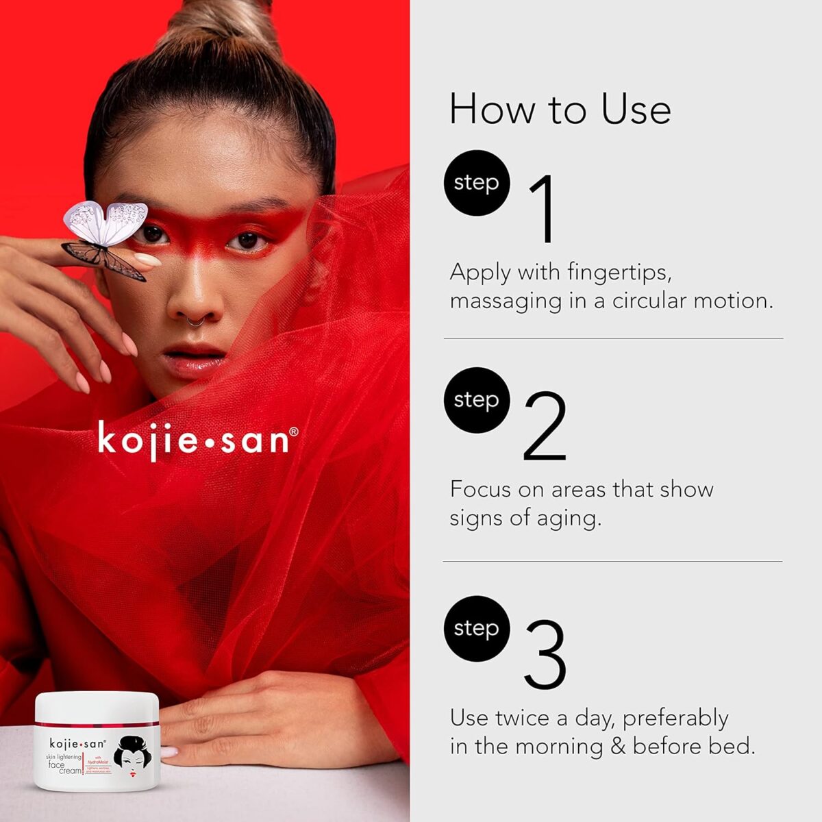 La Kojie San lightening face cream is a light, non-greasy mix of ingredients fromnatural plant extracts andkojic acidknown for his excellent whitening effect. This light face cream has been formulated with rosehips and vitamin E for a gentle, non-greasy hydration. The cream is infused with all-natural kojic acidwhich gently and safely brightens the skin.