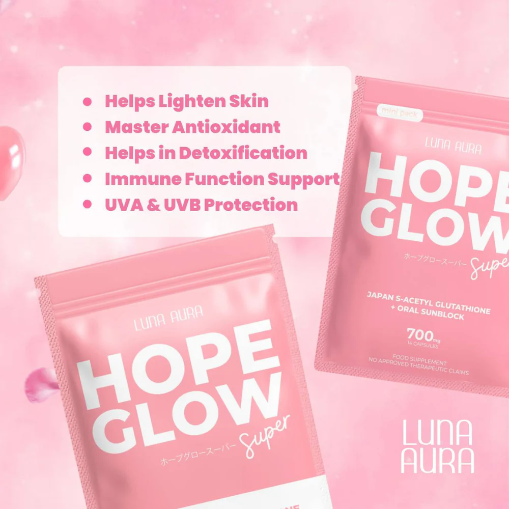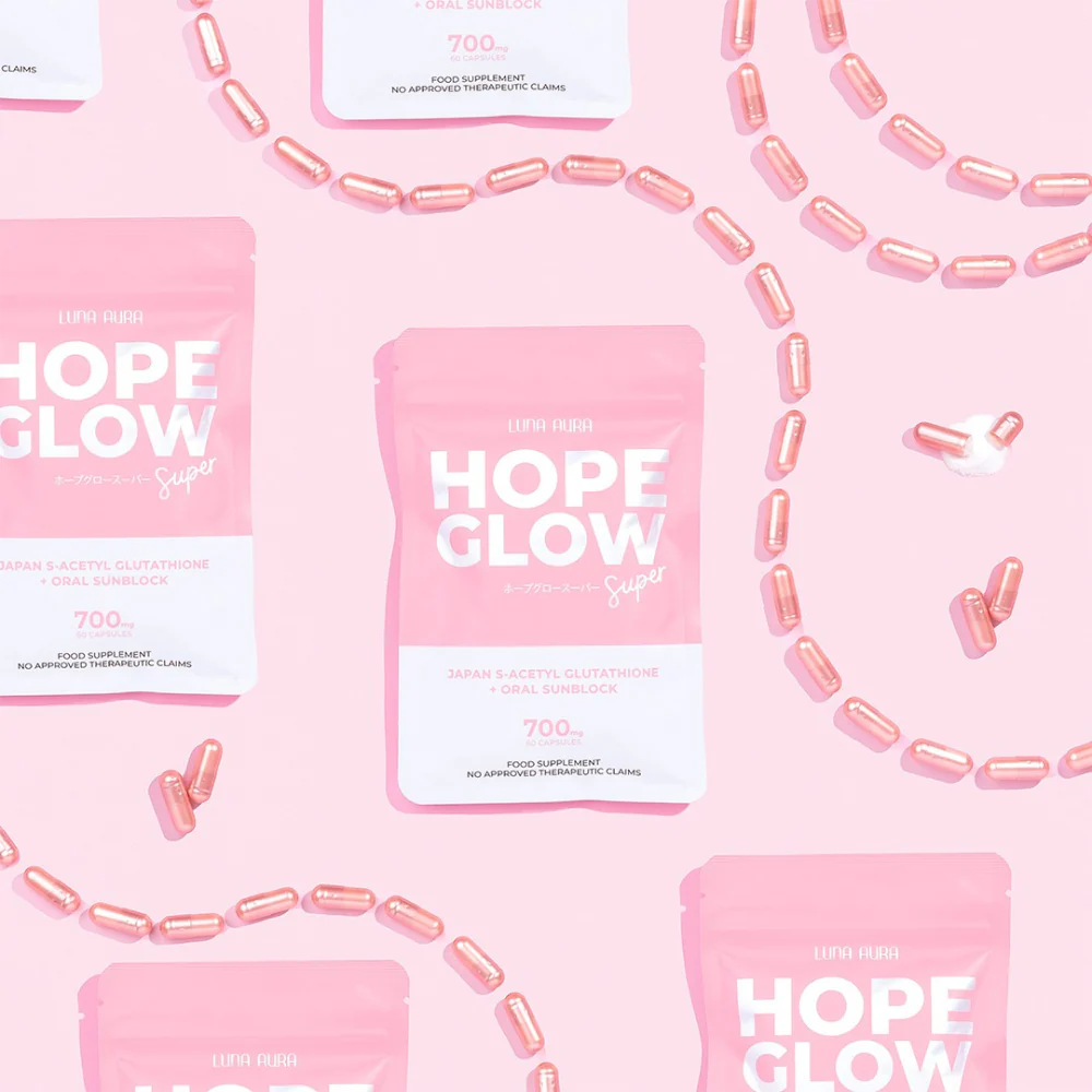 Say hello to your new everyday beauty partner, Hope Glow Super! Formulated with Japan S-Acetyl Glutathione and Oral Sunblock, this is our most advanced and enhanced Glutathione capsule yet.