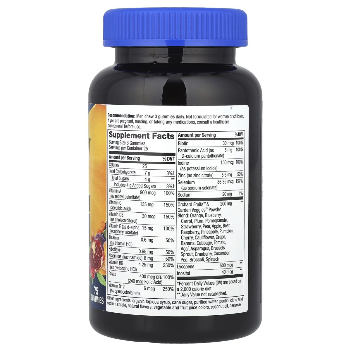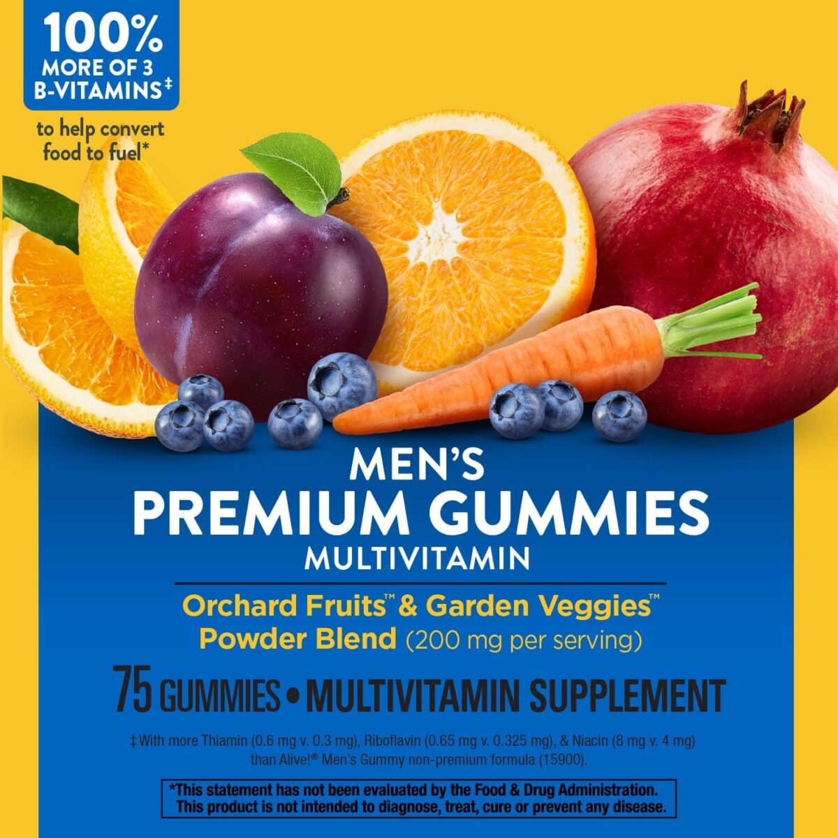‡ With more Thiamine (0.6 mg instead of 0.3 mg), Riboflavin (0.65 mg instead of 0.325 mg), and Niacin (8 mg instead of 4 mg) compared to the regular men’s gummy formula from Alive!®.