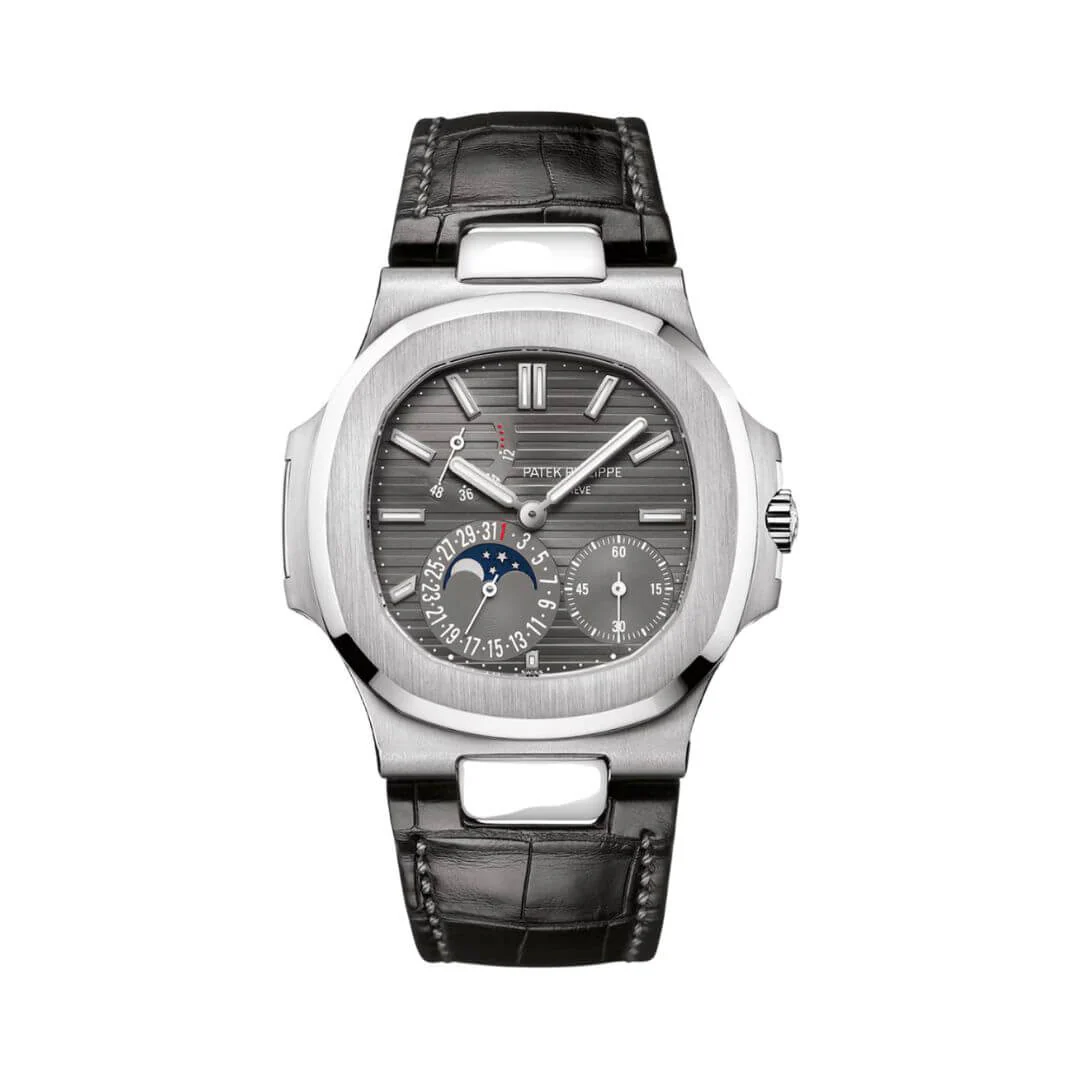 Introducing the Patek Philippe Nautilus 5712G-001 Slate Gray Indices Moon Phase 40mm 18k White Gold Black Matted Leather Straps Men’s Watch. This elegant timepiece combines style and practicality, making it perfect for modern men.