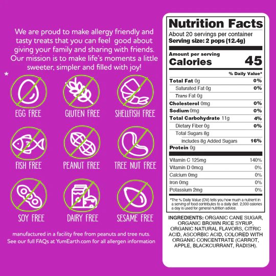 Organic cane sugar, organic brown rice syrup, organic natural flavors, citric acid, ascorbic acid, colored with organic concentrate (carrot, apple. blackcurrant, radish), organic turmeric extract (color).